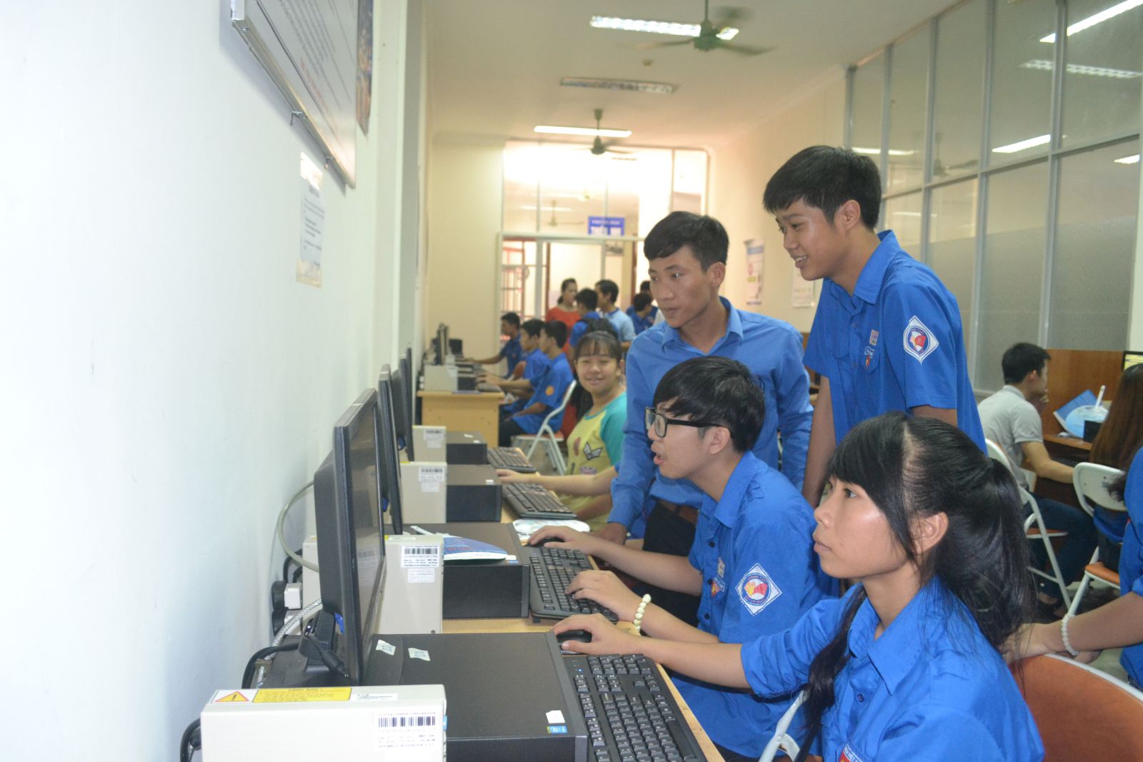 Các đoàn viên, sinh viên tham gia thi trên máy tính trong khuôn khổ các hoạt động ở ngày hội internet