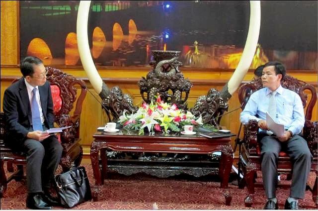 Phó Chủ tịch UBND tỉnh Nguyễn Văn Phương (phải) trao đổi một số thông tin với ông Yasuko Fujita