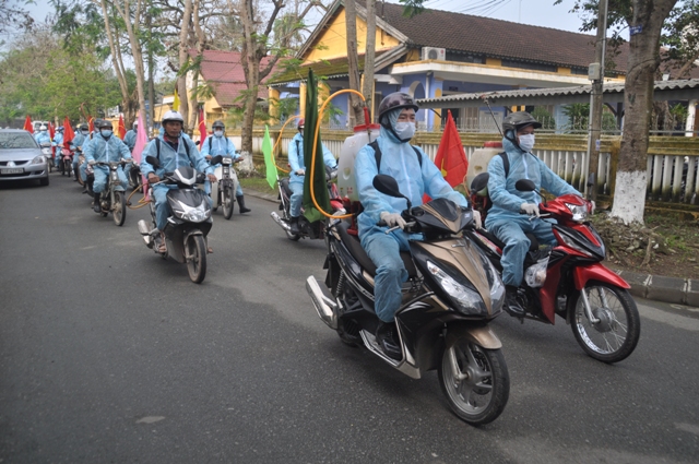 Đoàn xe sau khi đi tuyên truyền trong thành phố đã về cơ sở tiến hành phun thuốc tiêu độc khử trùng