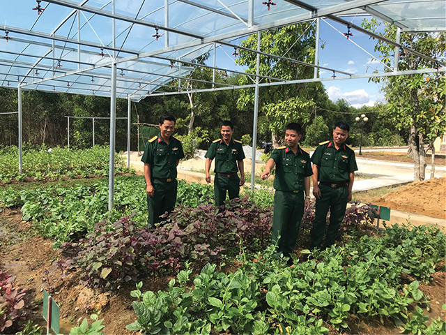 Dưới cái nắng như đổ lửa, những luống mồng tơi vẫn xanh mướt; giàn mướp, bầu, bí vẫn ra hoa, trĩu quả; vườn cà, rau muống đạt năng suất cao, đáp ứng 100% nhu cầu rau sạch cho bộ đội.