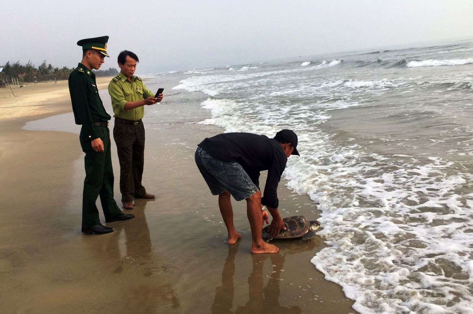 Sau các bước kiểm tra, nhận thấy cá thể rùa biển còn khỏe mạnh, bảo đảm sống được khi trở lại với môi trường tự nhiên, lực lượng chức năng cùng ngư dân đã thả cá thể rùa biển về môi trường biển tại biển Lăng Cô.