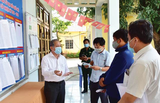 Chủ tịch UBND tỉnh, Trưởng đoàn ĐBQH tỉnh, Phó Chủ tịch Thường trực Ủy ban Bầu cử tỉnh Phan Ngọc Thọ kiểm tra công tác chuẩn bị bầu cử tại thị trấn Lăng Cô, huyện Phú Lộc. Ảnh: THÁI BÌNH