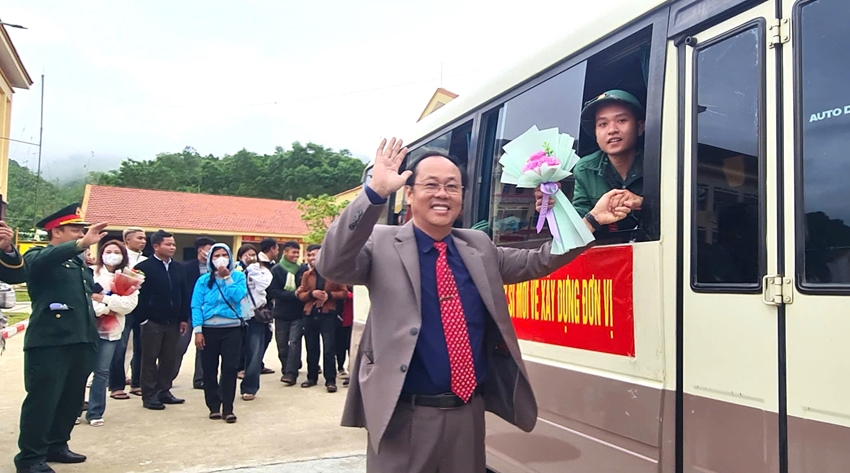 Thành ủy viên, Tổng Biên tập Báo và Phát thanh, Truyền hình Huế Hoàng Đăng Khoa tặng hoa tiễn thanh niên A Lưới lên đường nhập ngũ. Ảnh: NGUYỄN KHÁNH
