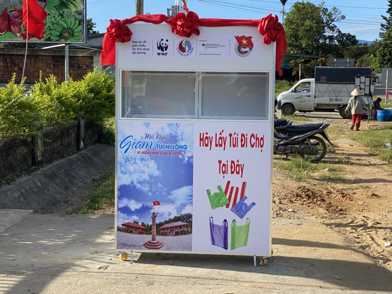 Tủ cung cấp túi đi chợ tại cổng chợ Bốt Đỏ