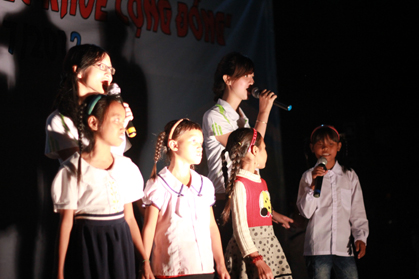 Sinh viên tình nguyện hát cùng các em học sinh A Roàng trong Đêm giao lưu văn nghệ
