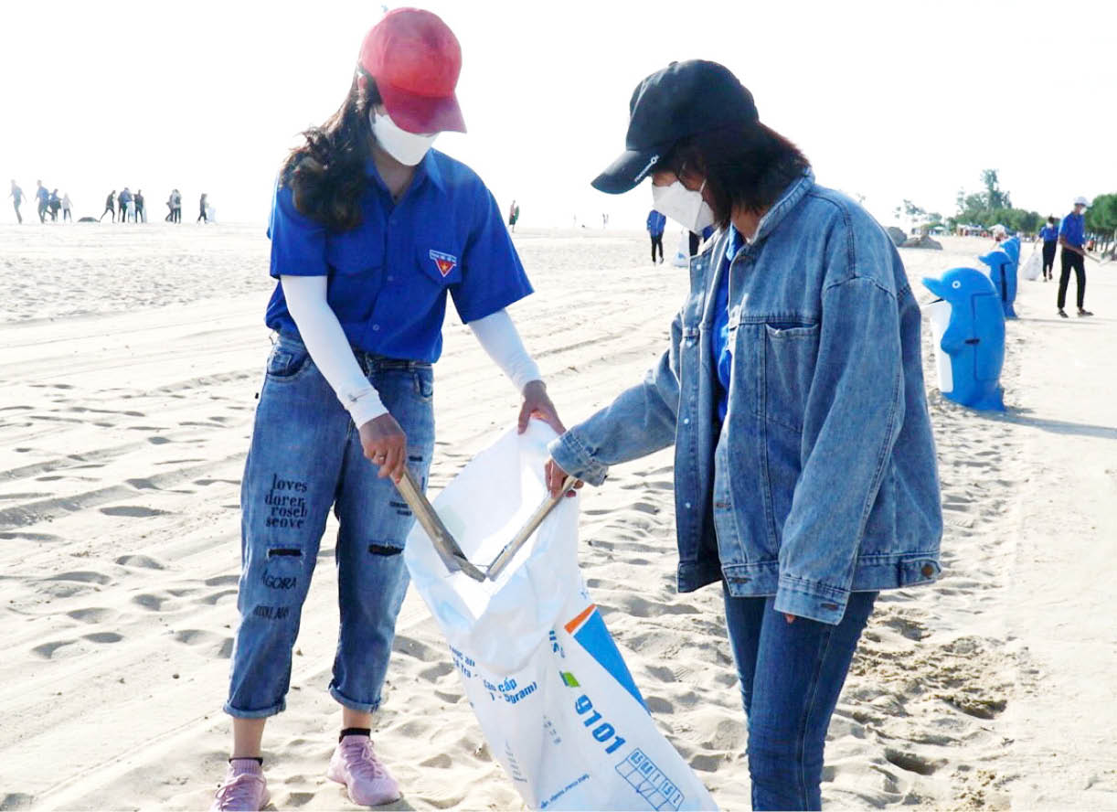 Học sinh tham gia dọn rác ở bãi biển Thuận An