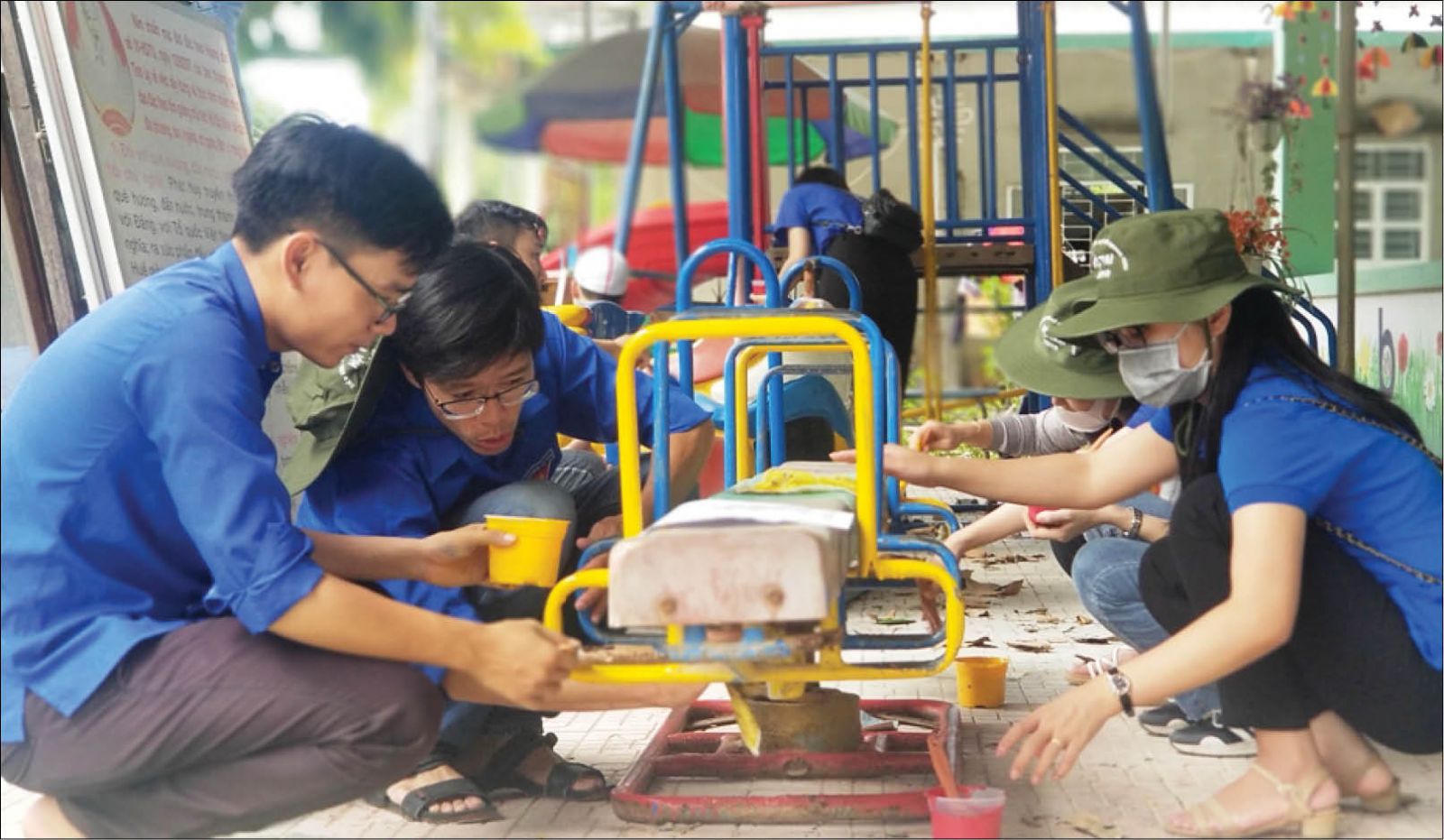 Đoàn viên thanh niên Đoàn Khối sửa chữa thiết bị vui chơi cho trẻ em tại Phú Sơn