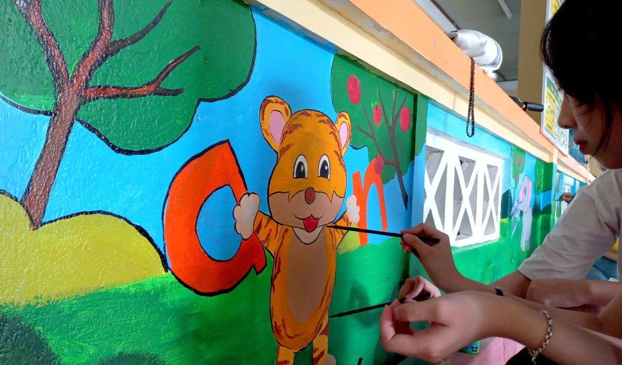 Tỉ mẩn vẽ từng hình ảnh trang trí tại Trường mầm non Hương Hữu