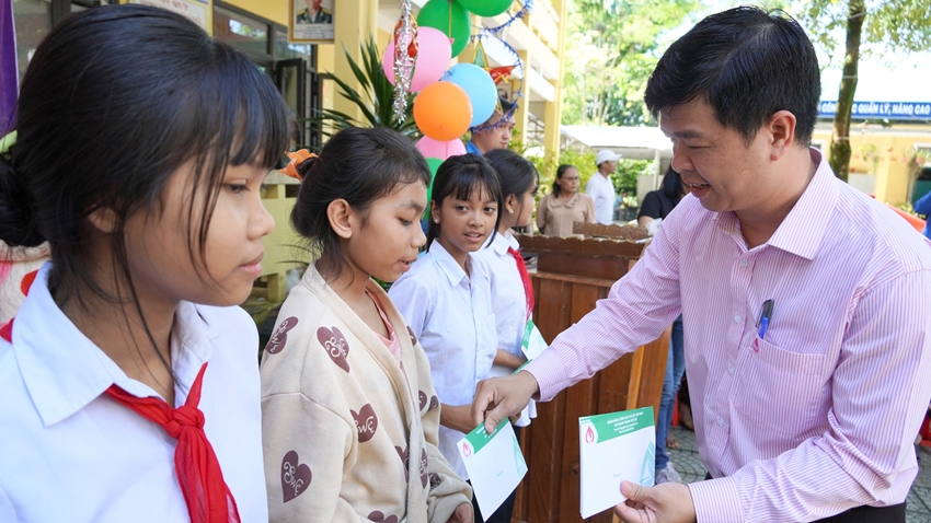 | Đại diện Ngân hàng Chính sách xã hội thành phố trao học bổng cho các em học sinh có thành tích tốt |
