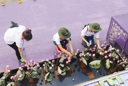 Các tình nguyện viên tham gia trang trí sân khấu cho lễ hội áo dài