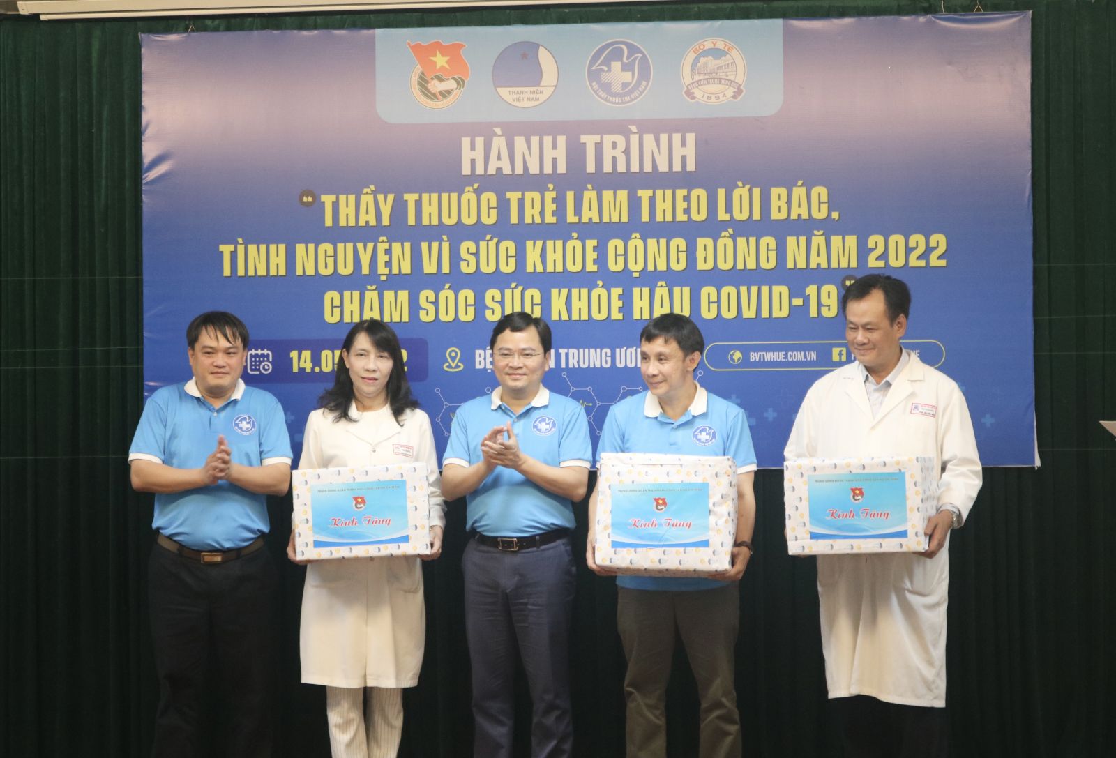 Bí thư Thứ nhất Trung ương Đoàn TNCS Hồ Chí Minh Nguyễn Anh Tuấn (ở giữa) tặng quà khích lệ đội ngũ y, bác sĩ Bệnh viên Trung ương Huế