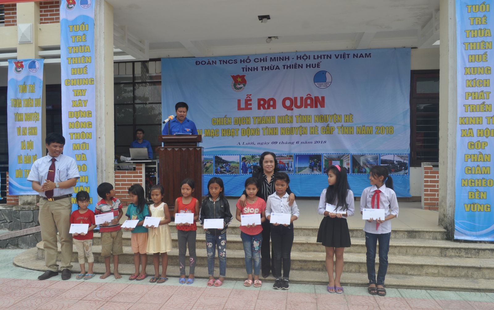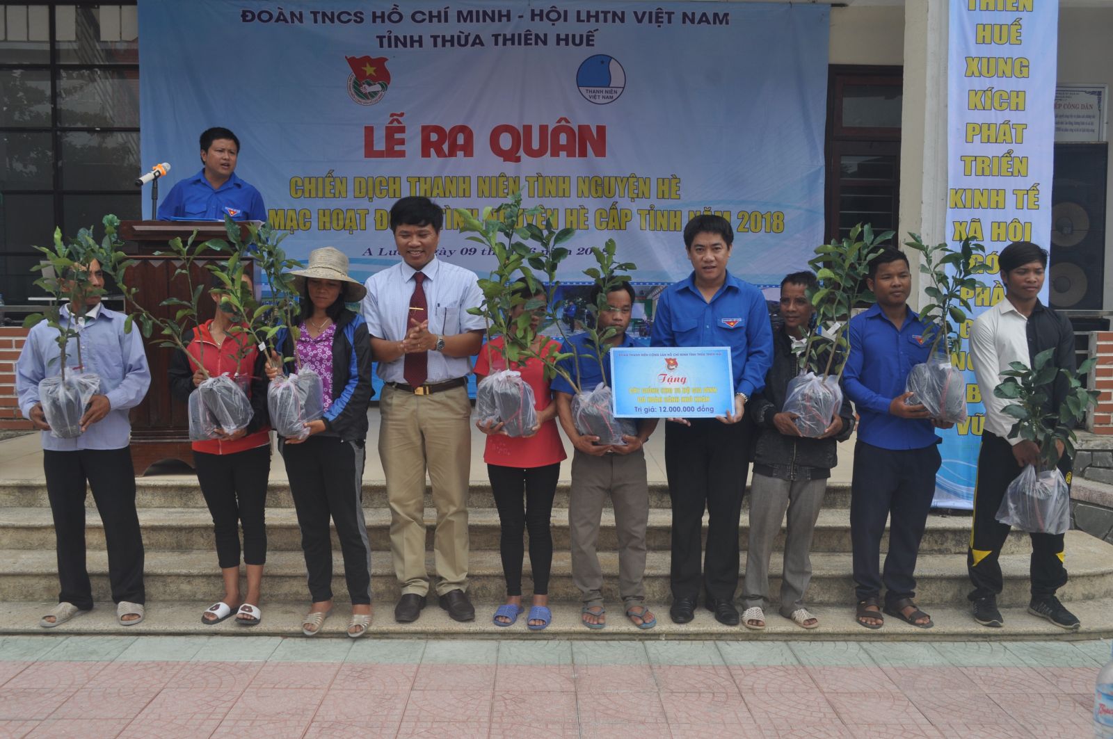 Tại lễ ra quân, Ban Thường vụ Tỉnh Đoàn trao tặng cây giống bưởi da xanh cho 15 hộ gia đình, tặng cá giống rô phi cho 12 hộ và 10 chuồng trại cùng heo giống cho 10 hộ có hoàn cảnh đặc biệt khó khăn, với tổng trị giá gần 50 triệu đồng. Đồng thời, trao 20 suất học bổng cho các em vượt khó học tốt và trao công trình 1,7km điện sáng nông thôn cho người dân địa phương…