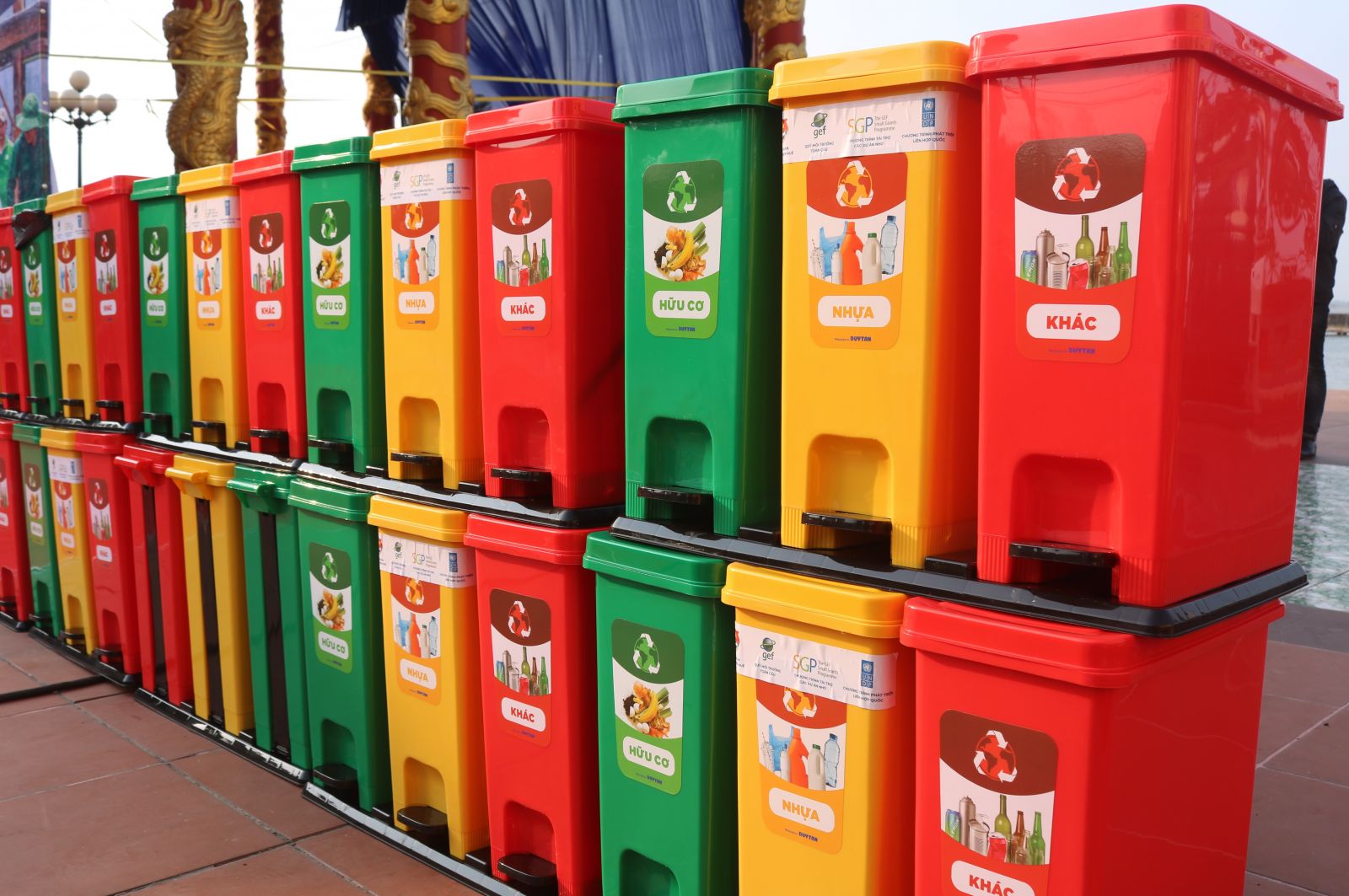 Thùng rác được chia thành các màu sắc đặc trưng và dán nhãn để người dân dễ dàng phân loại