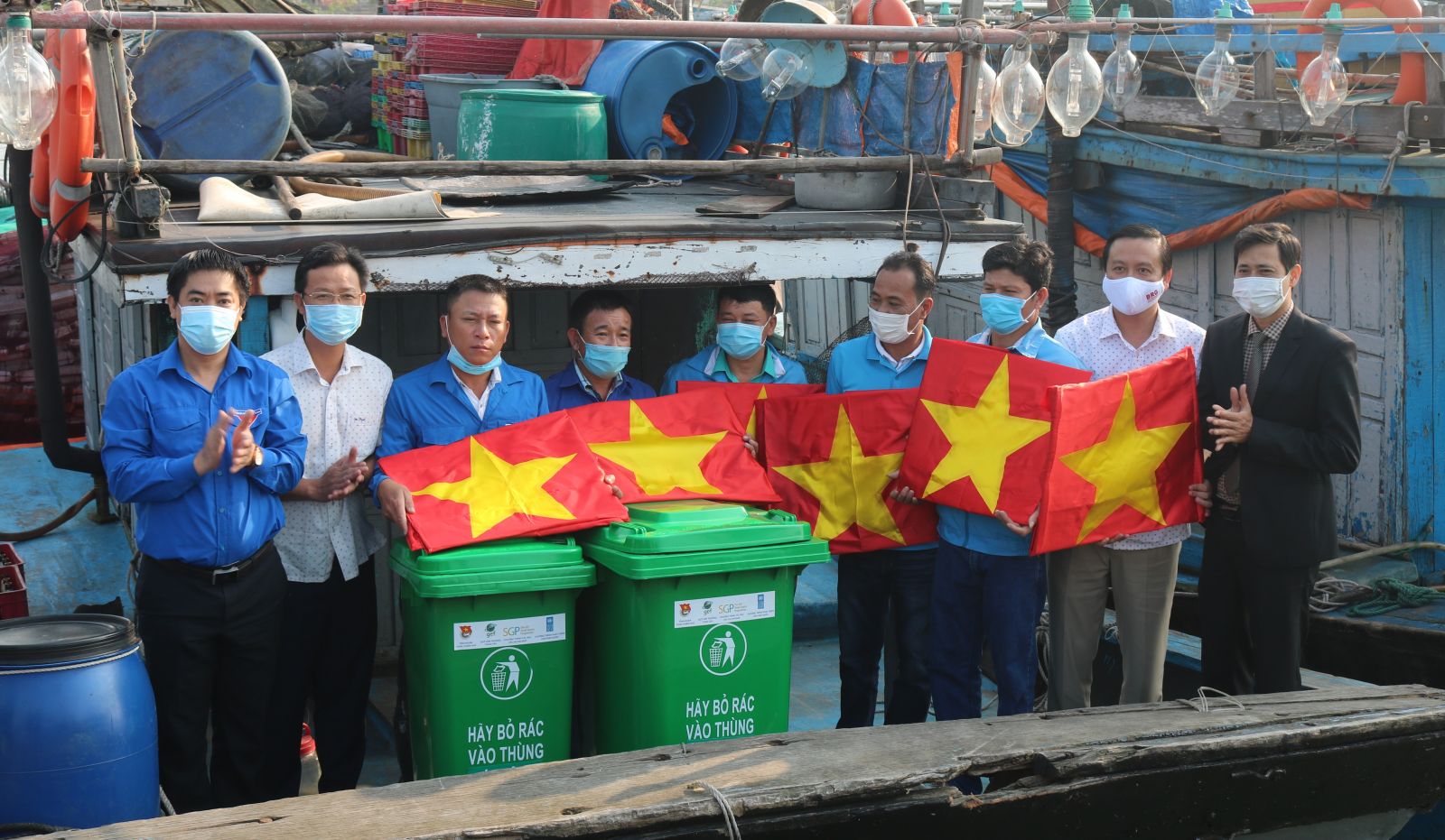 Đại diện Tỉnh đoàn, Ban Dân vận Tỉnh ủy và lãnh đạo huyện Phú Vang tặng cờ Tổ quốc cho ngư dân