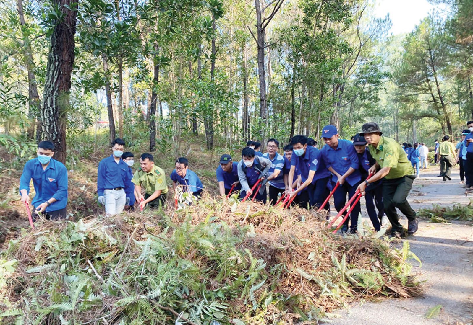 Đoàn viên sinh hoạt hè tại địa phương tham gia thu gom thực bì ở Khu di tích lịch sử Chín Hầm