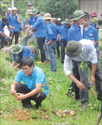 Thanh niên tình nguyện trồng cây xanh dọc đường liên thôn ở xã Thượng Long
