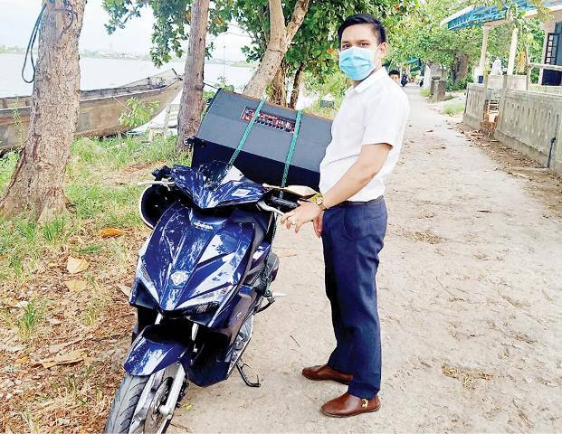 Hình ảnh hai chàng trai trẻ trên chiếc xe máy với thùng loa kéo cột trên yên và âm thanh ấy đã trở nên quen thuộc với bà con ở đây từ cuối tháng 6/2020, khi dịch bệnh COVID-19 bùng phát mạnh ở nhiều tỉnh, thành phố.