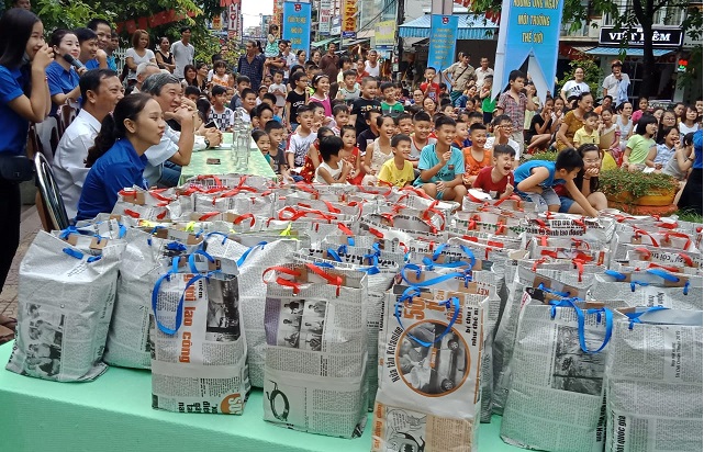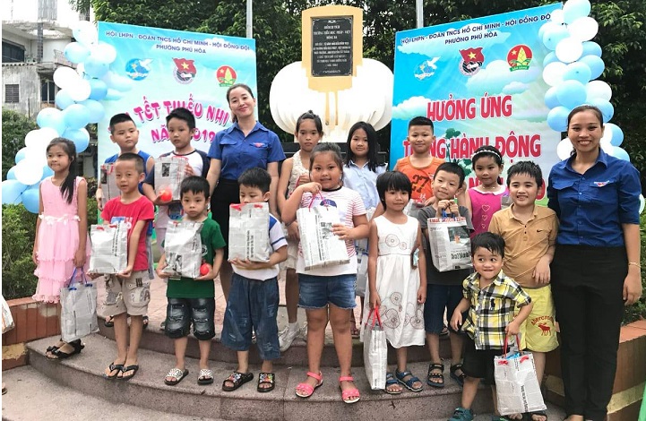 Hoạt động này được Đoàn phường Phú Hòa tổ chức thường niên cho các em nhỏ có hoàn cảnh khó khăn, nhưng năm nay toàn bộ túi đựng quà không phải là túi ni lông như trước mà được thay bằng những túi quà xinh xắn được làm từ giấy báo cũ.