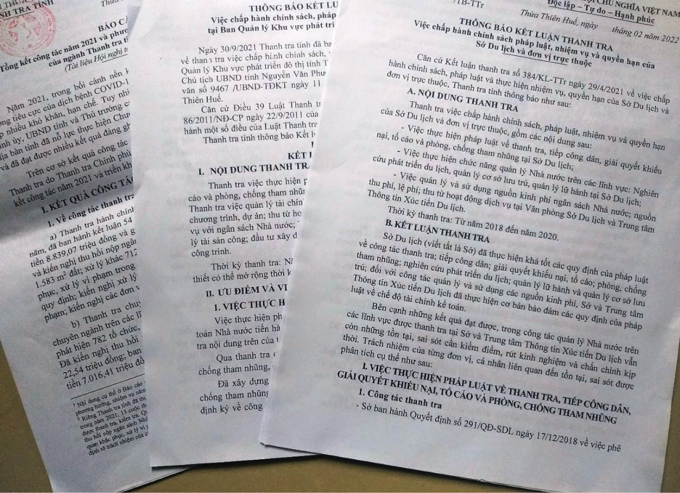 Thống kê của Thanh tra tỉnh, năm 2021, toàn ngành thanh tra đã thực hiện 96 cuộc thanh tra, kiểm tra hành chính; 848 cuộc thanh tra, kiểm tra chuyên ngành trên các lĩnh vực của đời sống xã hội đối với 4.078 tổ chức, cá nhân. Qua thanh tra đã phát hiện vi phạm với tổng số tiền hơn 8,8 tỷ đồng và gần 1.447,5 ha đất các loại; phát hiện 782 tổ chức, cá nhân có vi phạm với tổng số tiền gần 20 tỷ đồng…