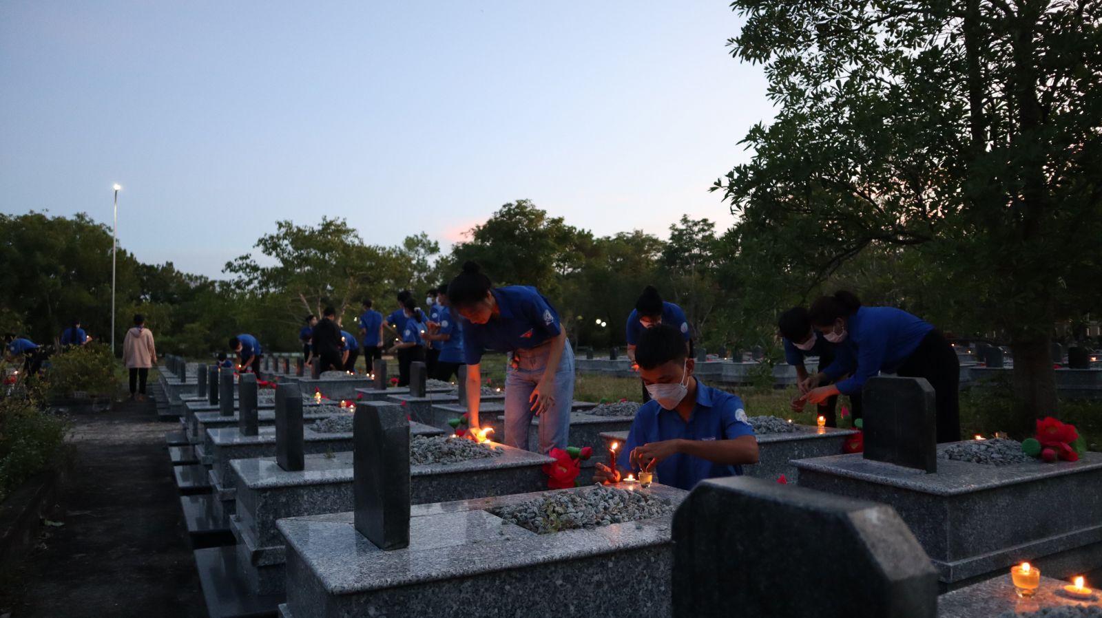 Sau phần tưởng niệm, từng phần mộ đã được lực lượng đoàn viên thanh niên thắp lên những ngọn nến.