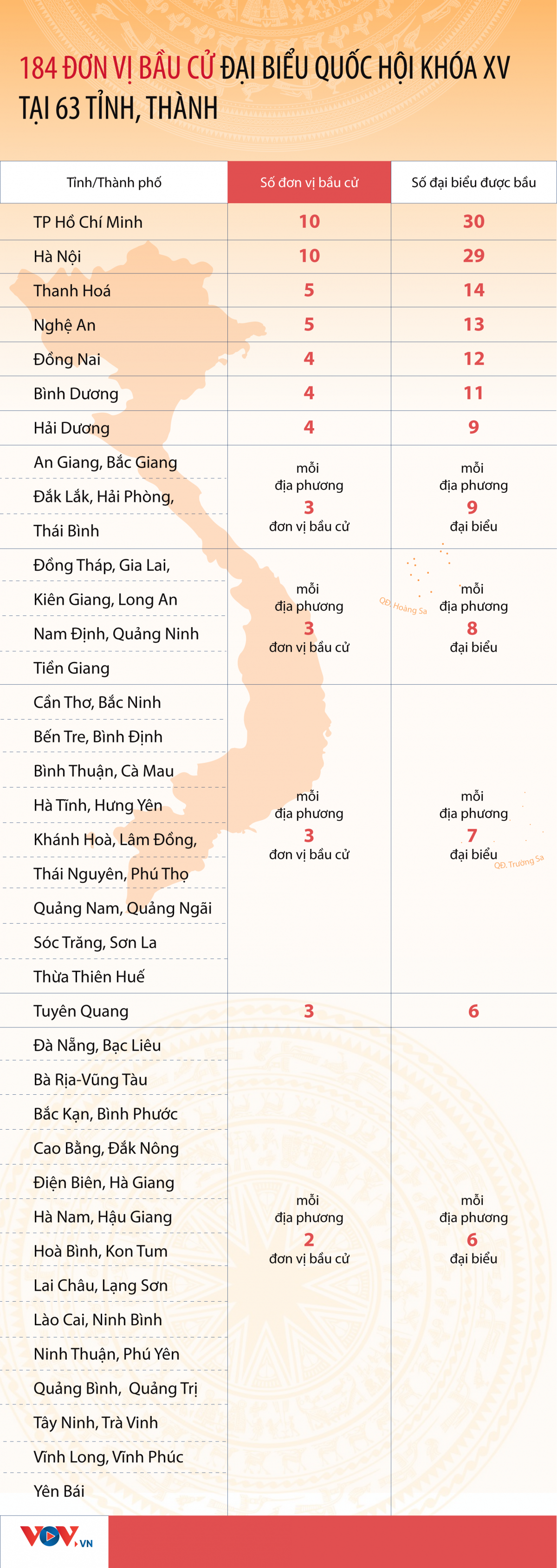 63 tỉnh, thành được phân bổ thành 184 đơn vị bầu cử đại biểu Quốc hội khóa XV. TP.HCM là địa phương có số lượng đơn vị bầu cử và số đại biểu được bầu cao nhất cả nước.