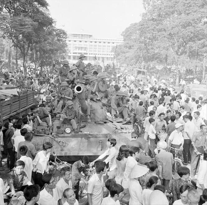 Nhân dân Sài Gòn đổ ra đường đón chào quân giải phóng chiếm phủ Tổng thống ngụy, trưa 30/4/1975. Ảnh: Lâm Hồng/TTXVN