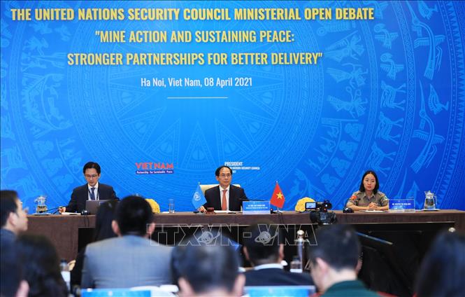 Bộ trưởng Bộ Ngoại giao Bùi Thanh Sơn chủ trì Phiên Thảo luận mở cấp Bộ trưởng của Hội đồng Bảo an LHQ về chủ đề "Khắc phục hậu quả bom, mìn và duy trì hòa bình bền vững: Tăng cường gắn kết để hiệu quả hơn". Ảnh: Lâm Khánh/TTXVN