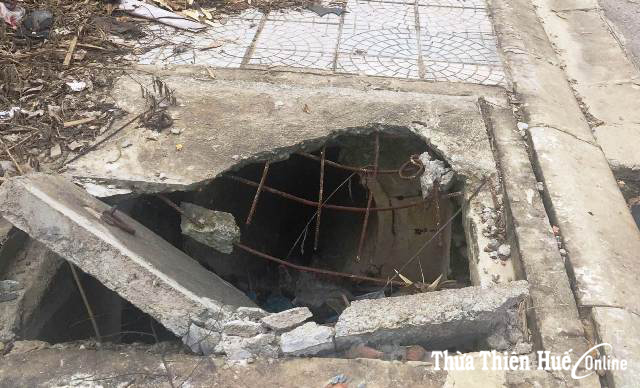 Đáng chú ý là đoạn phía sau Trường Chính trị Nguyễn Chí Thanh có một nắp hố ga bằng bê tông bị gãy, lòi các thanh sắt ra ngoài. Một nửa miệng hố ga cũng vì thế mà trống rỗng. Nếu không quan sát, người đi đường có thể rơi vào miệng hố ga.