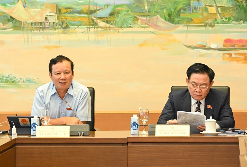 | Trưởng đoàn ĐBQH tỉnh Lê Trường Lưu (bên trái) nêu ý kiến tại buổi thảo luận. Ảnh: Đoàn ĐBQH tỉnh cung cấp |