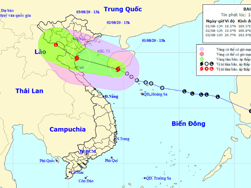 Dự báo trong 24 giờ tới, bão di chuyển theo hướng Tây Tây Bắc, mỗi giờ đi được 15-20 km. Đến 13 giờ ngày 2-8, vị trí tâm bão ở khoảng 19,5 độ vĩ bắc; 105,8 độ kinh đông, ngay trên vùng bờ biển các tỉnh Bắc Trung Bộ và nam đồng bằng Bắc Bộ. Sức gió mạnh nhất vùng gần tâm bão mạnh cấp 8 (60-75 km/giờ), giật cấp 10.