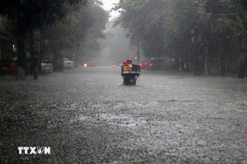 | Mưa lớn khiến nhiều tuyến đường tại Nghệ An ngập nặng. (Ảnh: TTXVN phát) |