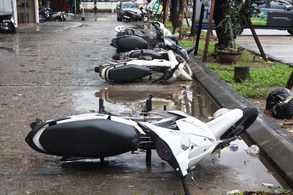 Dãy xe máy ở khu vực chung cư Đống Đa nằm nghiêng ngả do không chịu được sức mạnh của gió bão số 13