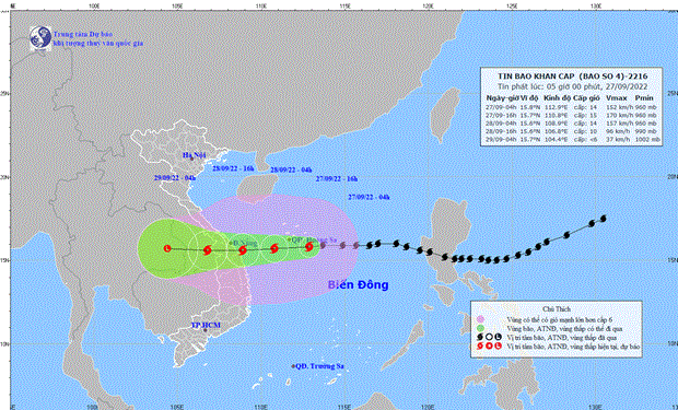 Theo Trung tâm Dự báo Khí tượng Thủy văn Quốc gia, hồi 4 giờ ngày 27/9, vị trí tâm bão số 4 ở trên vùng biển phía Đông Nam quần đảo Hoàng Sa. Sức gió mạnh nhất vùng gần tâm bão mạnh cấp 14 (150-166 km/giờ), giật cấp 16.