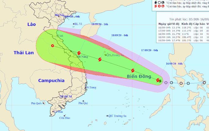 Hồi 4 giờ ngày 16-9, vị trí tâm bão số 5 ở vào khoảng 13,1 độ Vĩ Bắc; 118,2 độ Kinh Đông, cách đảo Paawan (Philippines) khoảng 200 km về phía Bắc Tây Bắc. Sức gió mạnh nhất vùng gần tâm bão mạnh cấp 8 (60-75 km/giờ), giật cấp 10.
