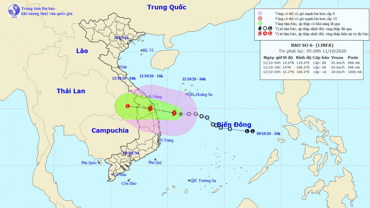 Hồi 4h ngày 11/10, vị trí tâm bão ở khoảng 14,6 độ Vĩ Bắc; 110,6 độ Kinh Đông, cách Quảng Nam khoảng 240km, cách Quảng Ngãi khoảng 180km, cách Bình Định khoảng 170km. Sức gió mạnh nhất vùng gần tâm bão mạnh cấp 8 (60-75km/giờ), giật cấp 10. Bán kính gió mạnh từ cấp 6 trở lên khoảng 150km tính từ tâm bão.