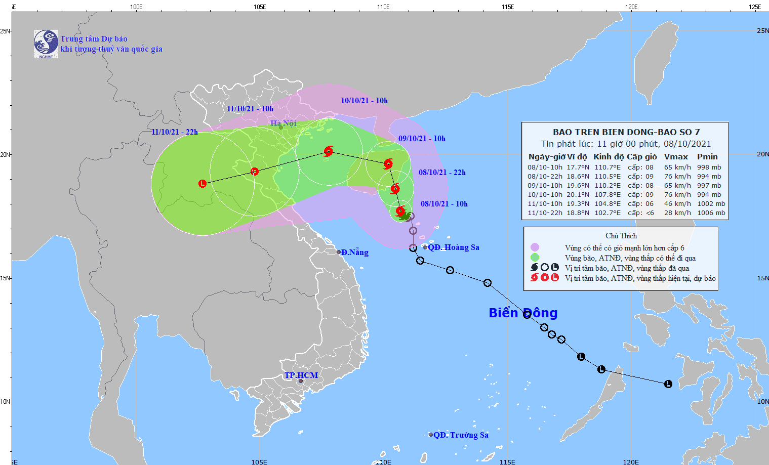 Theo Trung tâm Dự báo Khí tượng Thủy văn Quốc gia, hồi 10 giờ ngày 8/10, tâm bão số 7 ở vào khoảng 17,7 độ Vĩ Bắc; 110,7 độ Kinh Đông, cách đảo Hải Nam (Trung Quốc) khoảng 130km về phía Nam Đông Nam. Sức gió mạnh nhất vùng gần tâm bão mạnh cấp 8 (60-75km/giờ), giật cấp 10. Bán kính gió mạnh cấp 6, giật cấp 8 khoảng 120km tính từ tâm bão.