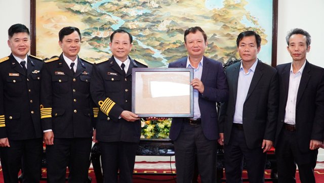 Bí thư Tỉnh ủy Lê Trường Lưu, Chủ tịch UBND tỉnh Nguyễn Văn Phương tặng quà lưu niệm đến Đoàn công tác BTL Vùng 3 Hải quân