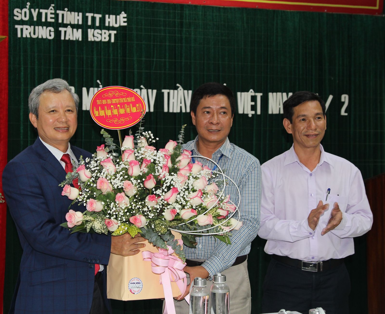 Bí thư Tỉnh ủy Lê Trường Lưu (bên trái) tặng hoa chúc mừng Trung tâm Kiểm soát bệnh tật tỉnh