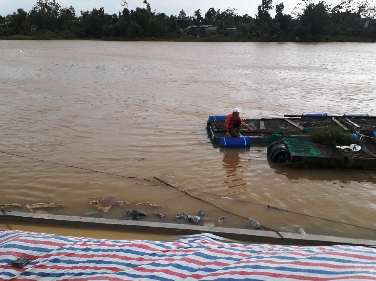 Người dân sống ven sông Bồ qua huyện Quảng Điền tranh thủ giằng néo lại những diện tích cá lồng trước khi thủy điện tăng lưu lượng xả lũ