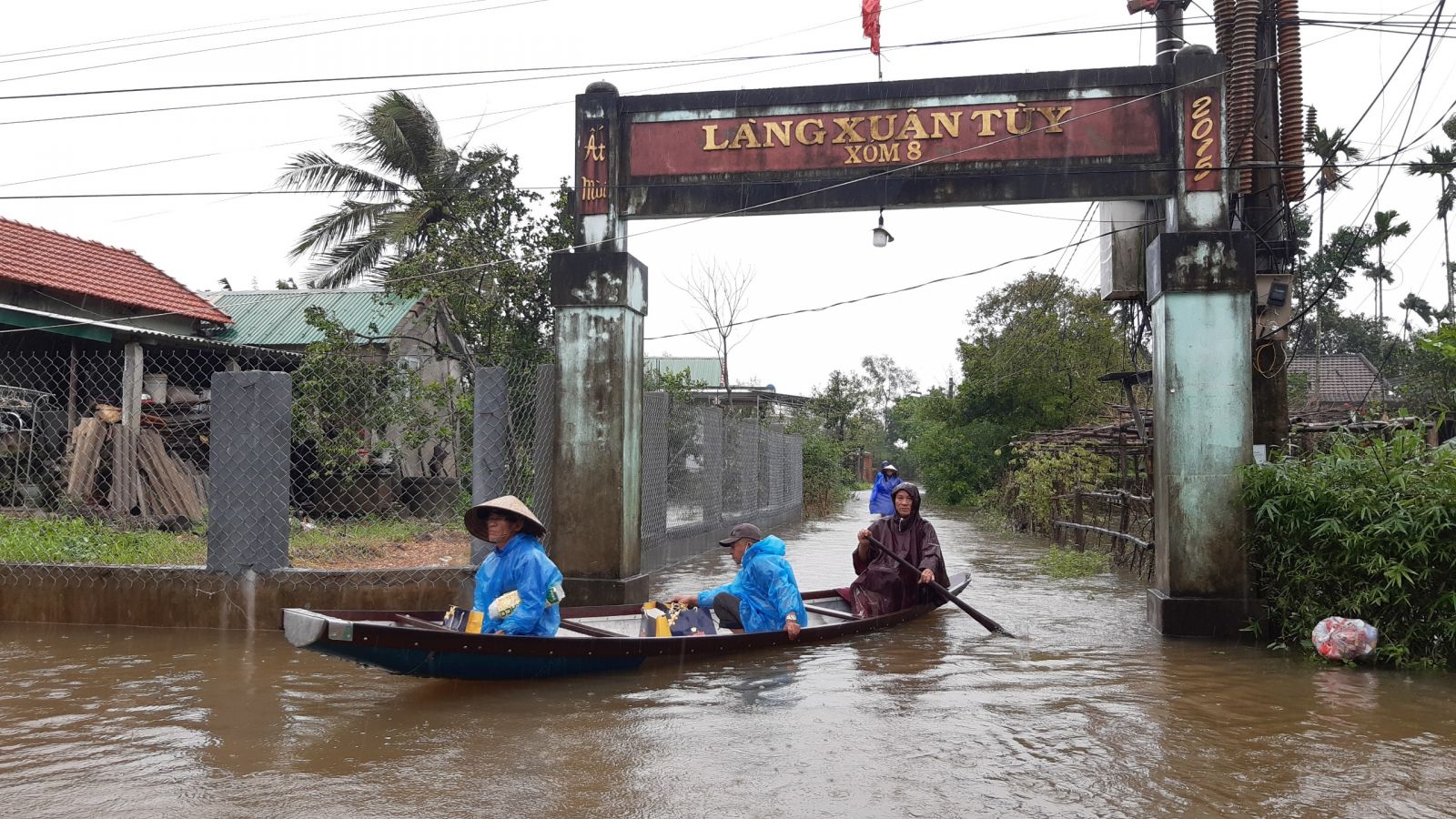 Người dân làng Xuân Tùy (Quảng Phú) đi lại bằng thuyền khi nước sông Bồ lên cao