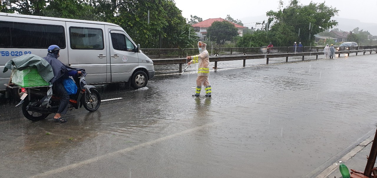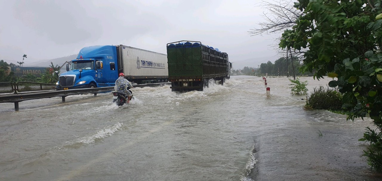 Quốc lộ 1A qua xã Lộc Trì (Phú Lộc) bị ngập khá sâu, giao thông khó khăn