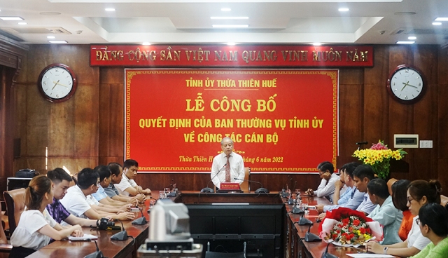 Phó Bí thư Thường trực Tỉnh ủy Phan Ngọc Thọ; UVTV Tỉnh ủy, Trưởng ban Tổ chức Tỉnh ủy Phan Xuân Toàn; UVTV Tỉnh ủy, Trưởng ban Nội chính Tỉnh ủy Đặng Ngọc Trân dự lễ công bố.