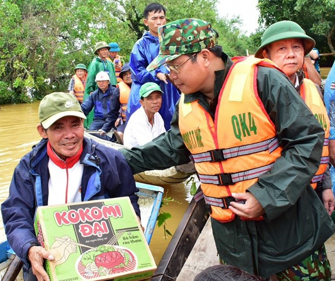 Thượng tá Ngô Nam Cường, Chỉ huy trưởng Bộ CHQS tỉnh tặng mì tôm cho người dân vùng lũ huyện Phong Điền