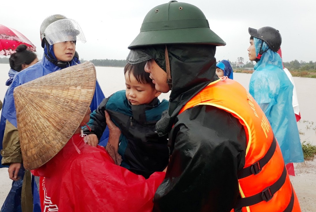 Nước lũ về nhanh, cùng với mưa lớn mấy ngày liên tục đã làm cho thôn Châu Thành, xã Lộc An, huyện Phú Lộc bị cô lập hoàn toàn, nguy cơ mất an toàn tính mạng, tài sản cho người dân trong thôn rất cao. Ban CHQS huyện Phú Lộc cử 25 cán bộ, nhân viên cùng với lực lượng dân quân của xã, huy động 1 ca nô, 3 ghe, 2 xe ô tô khẩn trương cơ động xuống địa bàn thôn Châu Thành để di dời người dân đến nơi tránh trú an toàn.