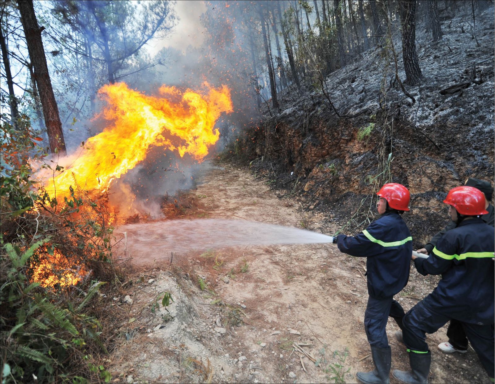 Đám cháy lưng chừng núi khiến xe chữa cháy và vòi cứu hỏa không thể phát huy tác dụng. Trước tình hình này, lực lượng của Bộ CHQS tỉnh tiếp tục trở thành chủ công, phối hợp với các lực lượng có mặt vượt núi dập lửa.