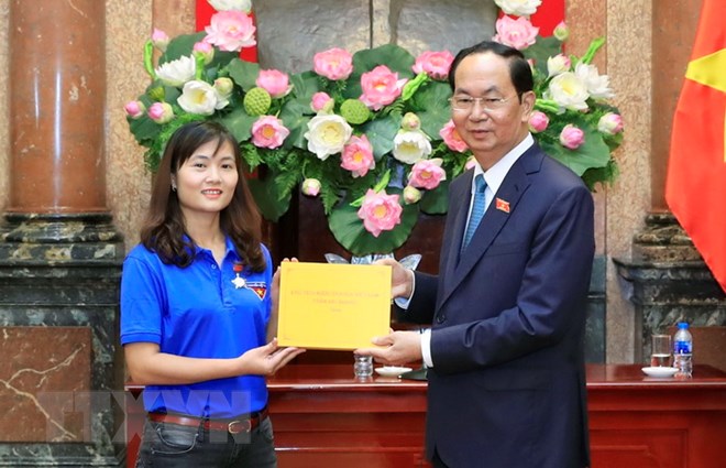 Chủ tịch nước Trần Đại Quang tặng quà cho chị Cao Thị Thùy Giang là đoàn viên Đoàn Thanh niên Cộng sản Hồ Chí Minh Thông tấn xã Việt Nam, Phóng viên báo điện tử VietnamPlus. (Ảnh: Nhan Sáng/TTXVN)