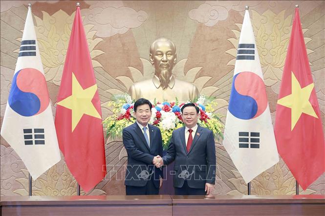 Chủ tịch Quốc hội Vương Đình Huệ và Chủ tịch Quốc hội Hàn Quốc Kim Jin-pyo. Ảnh: Doãn Tấn/TTXVN