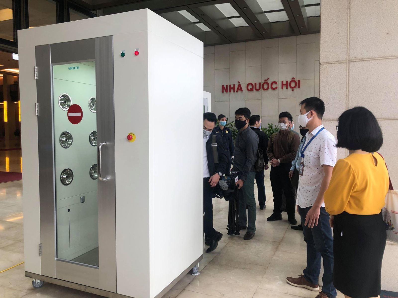 Tòa nhà Quốc hội vừa được trang bị 2 máy khử khuẩn toàn thân. Tất cả đại biểu khi đến dự phiên họp 43 của UB Thường vụ QH đều đi qua máy từ 10 - 20 giây để khử khuẩn phòng chống dịch Covid-19