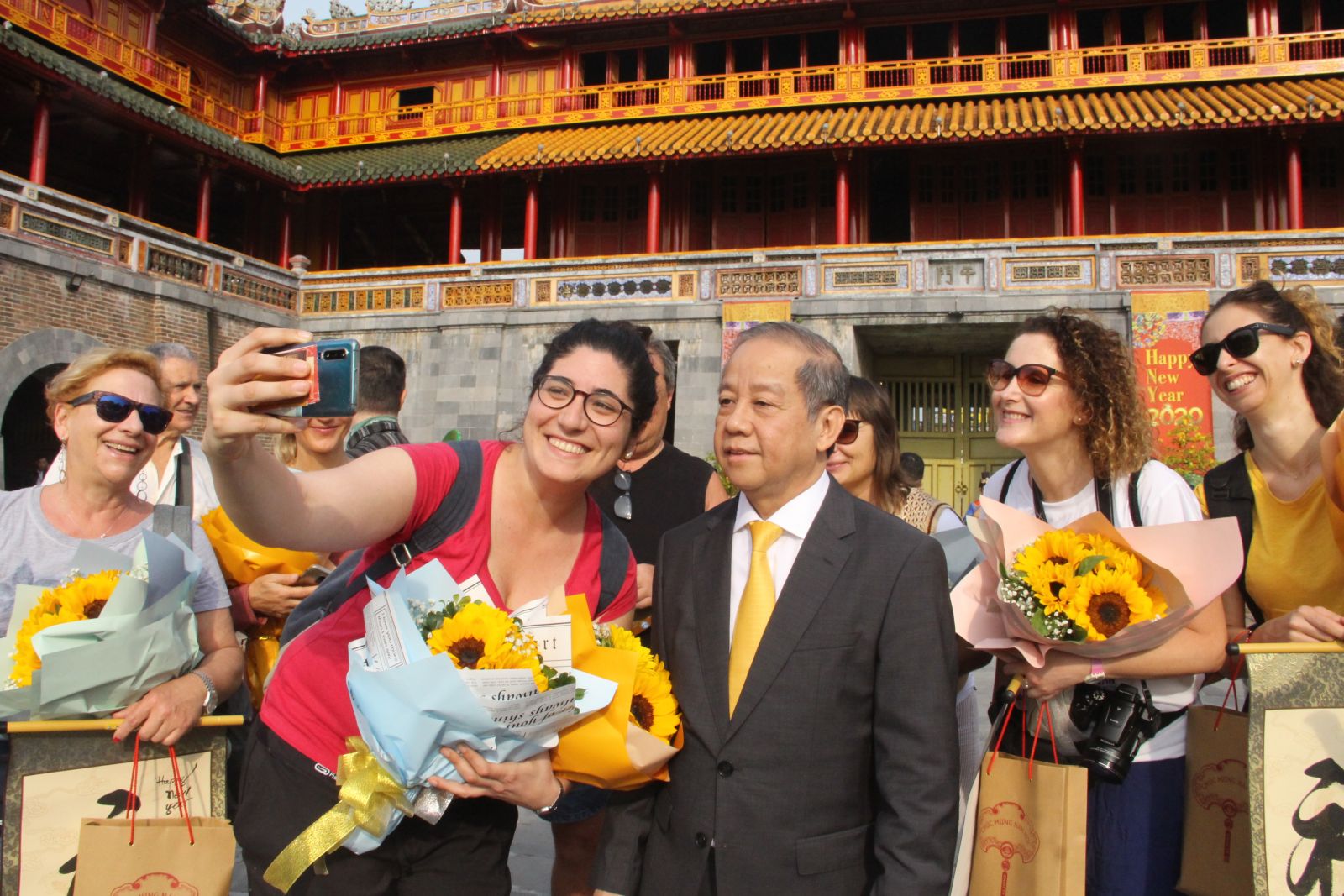 Chủ tịch UBND tỉnh chụp ảnh selfie với các du khách nước ngoài xông đất Đại nội Huế