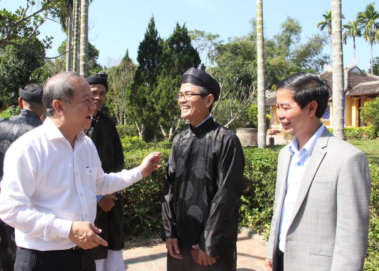 Chủ tịch UBND tỉnh Phan Ngọc Thọ nói chuyện với hậu duệ cụ Đặng Huy Trứ sau khi vào dâng hương tại nhà thờ